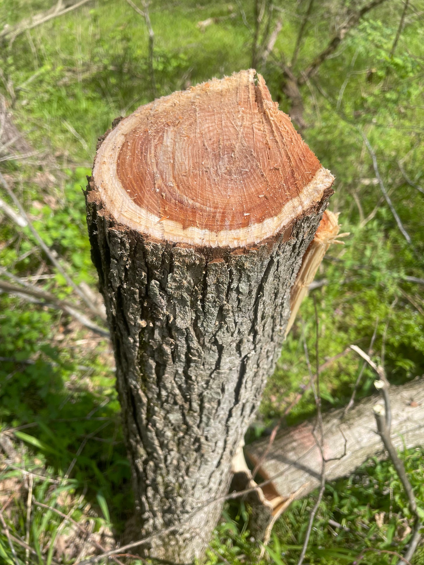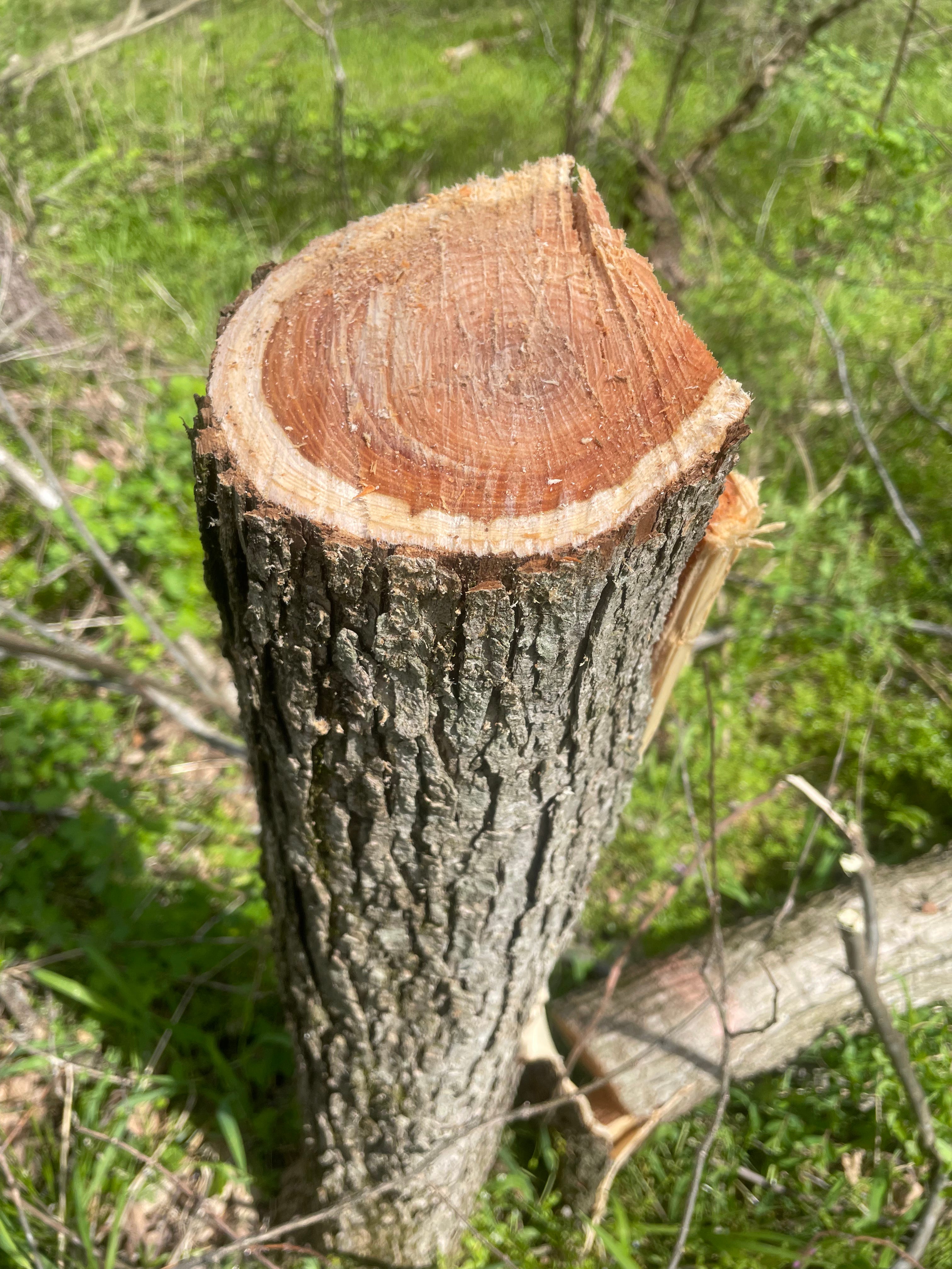 After we’ve cut a tree that we don’t want to grow back, we’ll add a little tree poison/herbicide to the narrow living part of the stump.